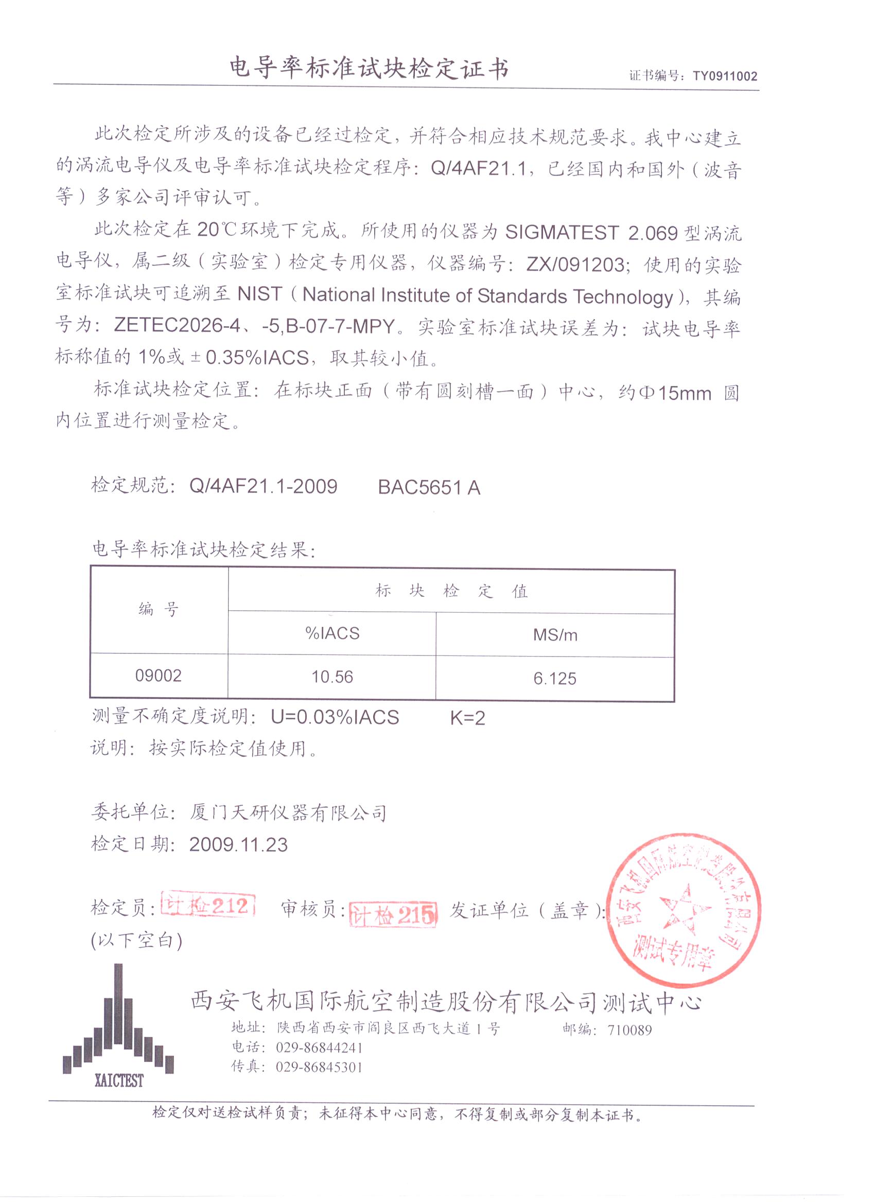 西飛渦流導(dǎo)電儀標(biāo)塊檢定證書