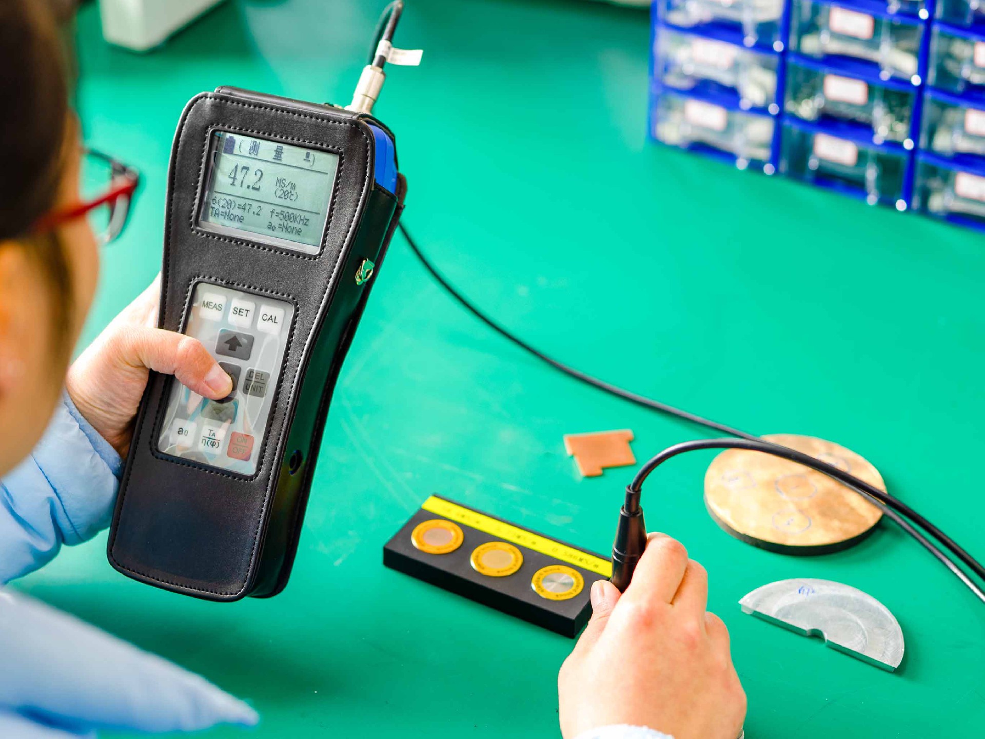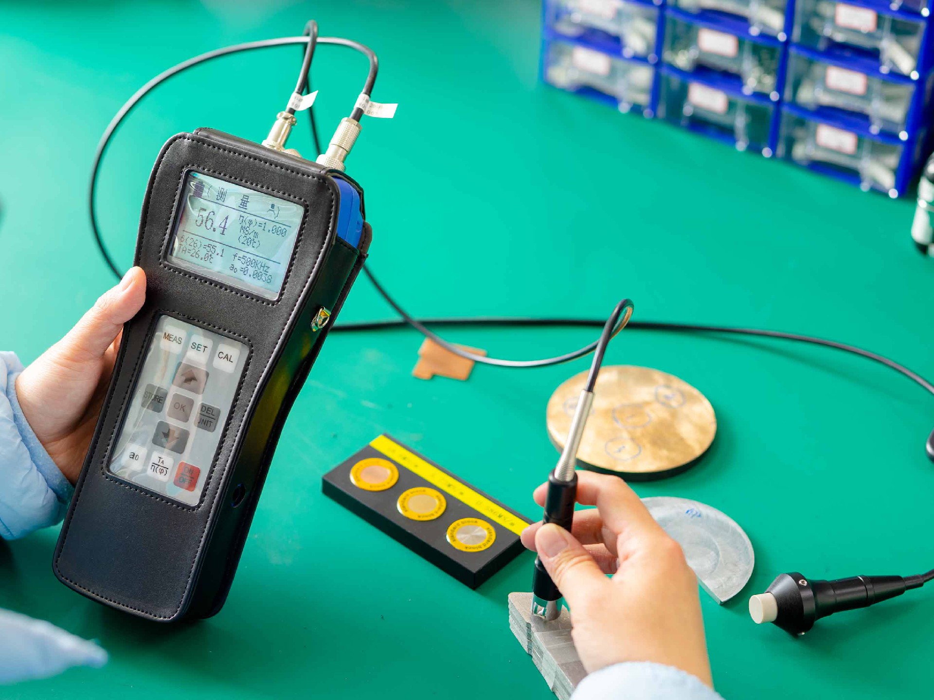 目前常用工作頻率為60KHz和500KHz兩種,60KHz為航空工業(yè)電導(dǎo)率測試標(biāo)準(zhǔn),而要測量薄板材料電導(dǎo)率值就只能用500KHz。B是國內(nèi)唯一附帶高低頻雙探頭,高頻探頭頻率達(dá)到500KHz的儀器。高頻率探頭能測試0.1mm~0.3mm的超薄工件,再薄的工件也無需擔(dān)心。